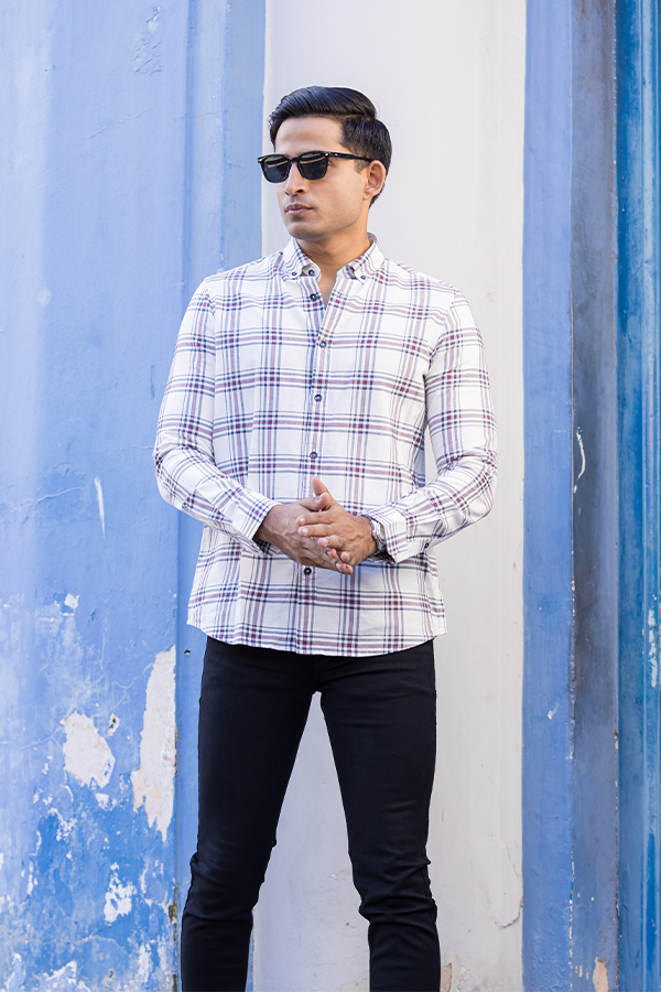 This slim-fit Oxford cotton shirt features a classic checkered pattern, full sleeves, and a mid-cutaway collar, perfect for semi-casual occasions.