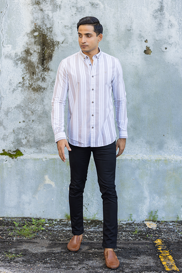 This slim-fit Oxford cotton shirt features blue & beige vertical stripes, full sleeves, and a mid-cutaway collar, perfect for semi-casual occasions.