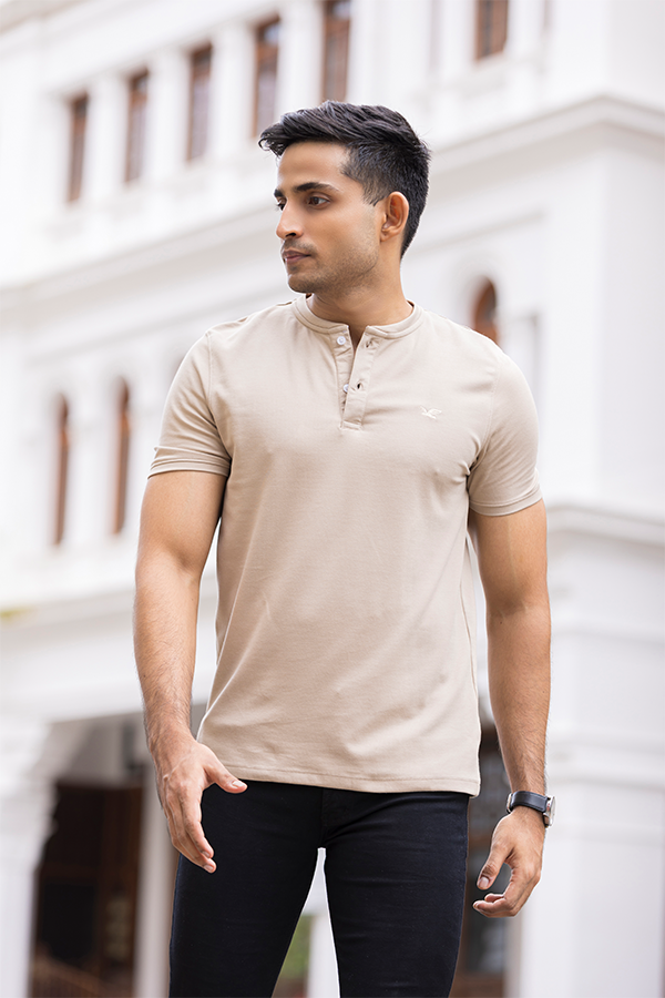 Classic beige slim-fit Henley T-shirt with full sleeves and a comfortable cotton blend. A versatile staple for effortless style.